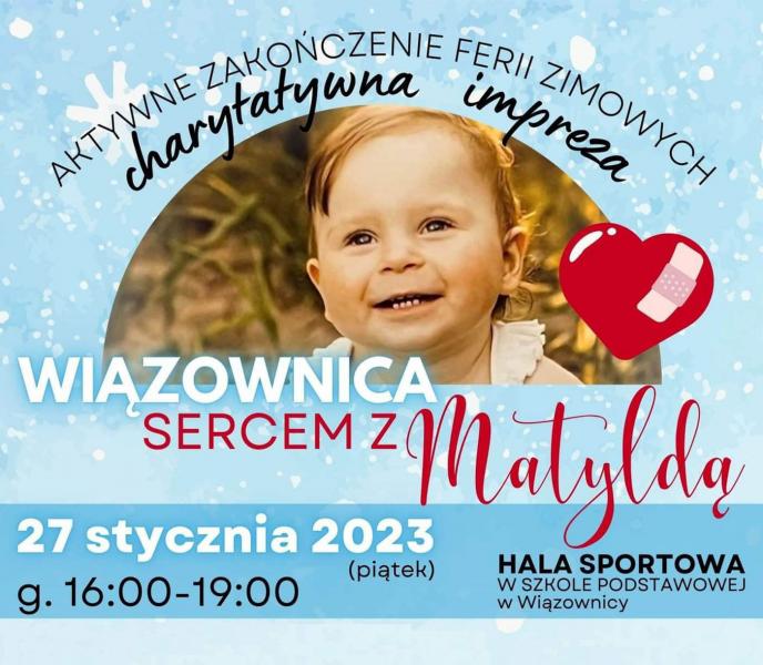 W piątek, 27 stycznia, na Hali Sportowej w Szkole Podstawowej w Wiązownicy odbędzie się impreza charytatywna dedykowana małej Matyldzie. W programie gry i zabawy dla dzieci, zabawy z animatorem, malowanie twarzy, kiermasze i zajęcia taneczne i dużo więcej. Datki zebrane podczas wydarzenia zostaną w pełni przekazane na leczenie chorej dziewczynki. Wspólnymi siłami damy radę zebrać pieniądze na operację serca dziecka. Impreza potrwa od godz. 16:00 do 19:00.