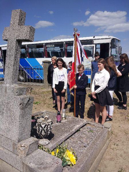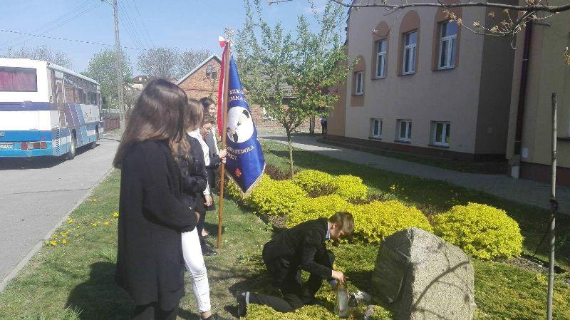 Po części artystycznej delegacja uczniów wraz z dyrektor Agnieszką Kukułką zapaliła znicze przed tablicą upamiętniającą posadzenie dębu pamięci Michała Nadwyczawskiego oraz na cmentarzu, gdzie znajdują się mogiły zamordowanych w 1945 roku.