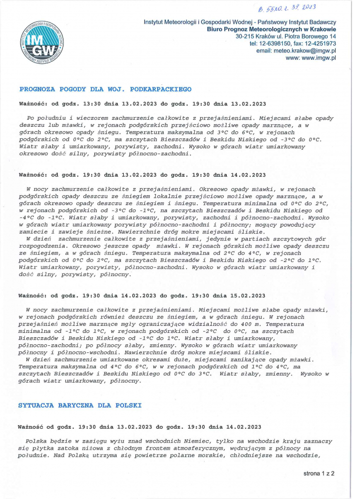 Ważność:   od godz. 07:30 dnia 15.02.2023 r. do godz. 07:30 dnia 16.02.2023 r.