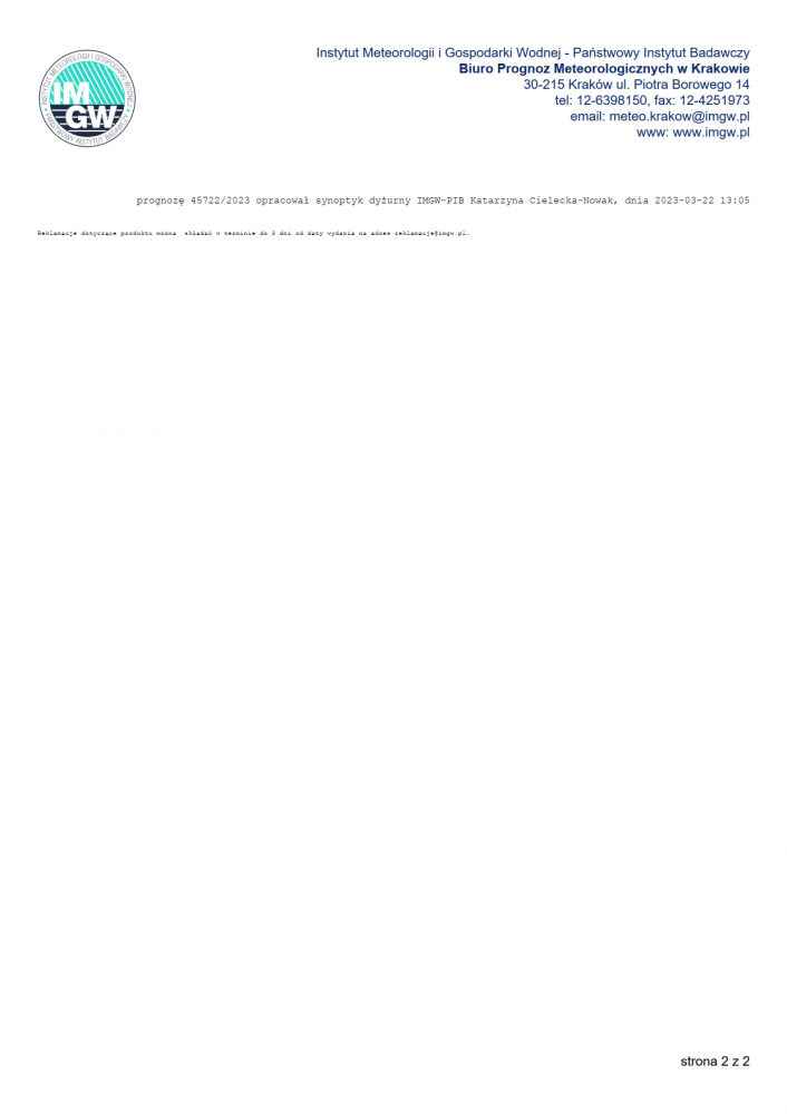 Ważność:   od godz. 07:30 dnia 23.03.2023 r. do godz. 07:30 dnia 24.03.2023 r.